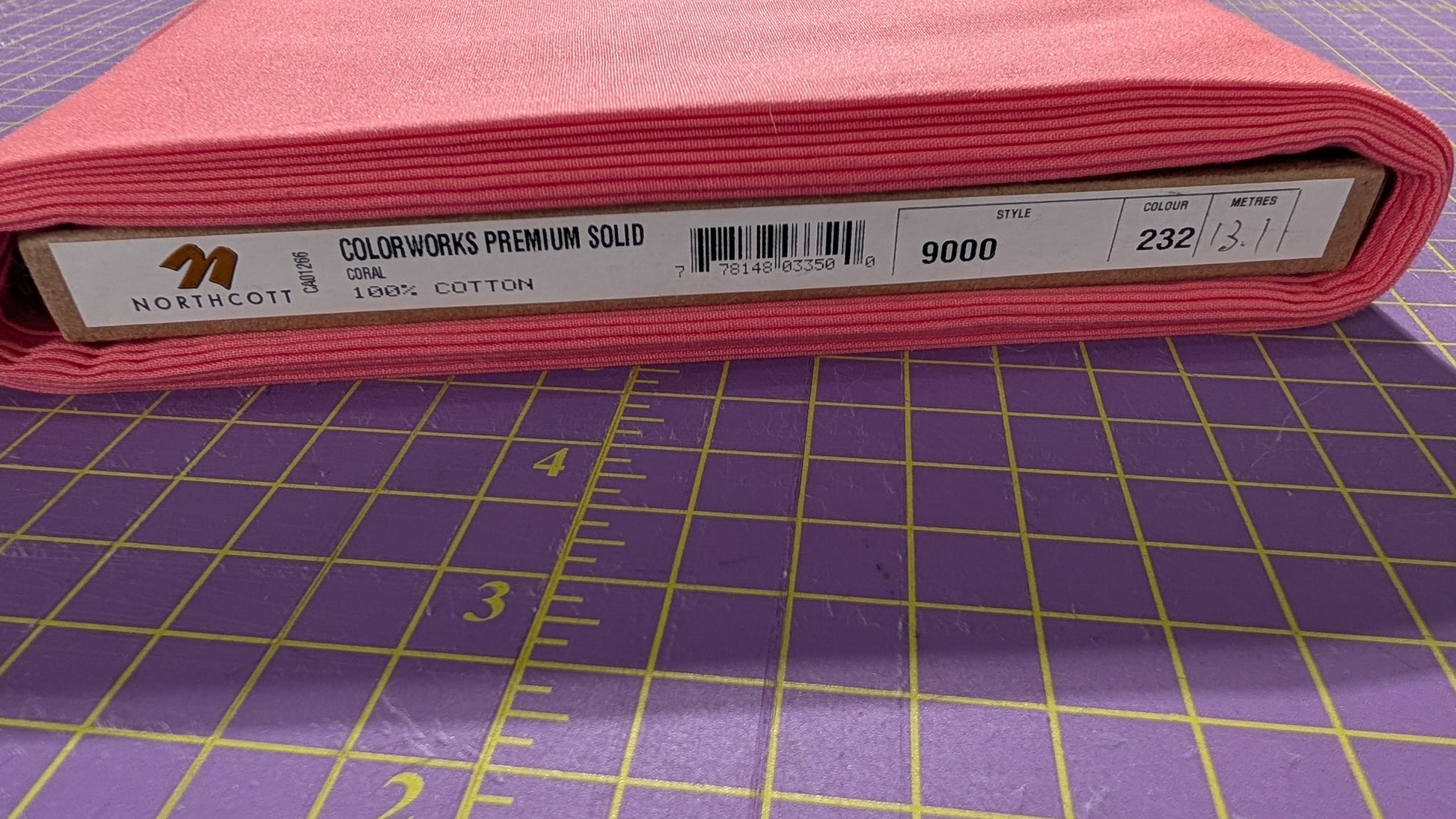 The ColorWorks Premium Solids line is known for its luxurious hand, consistent dye quality, and wide range of designer-selected colors. Coral brings a burst of warmth that works equally well in tropical palettes, floral designs, or modern geometric quilts.